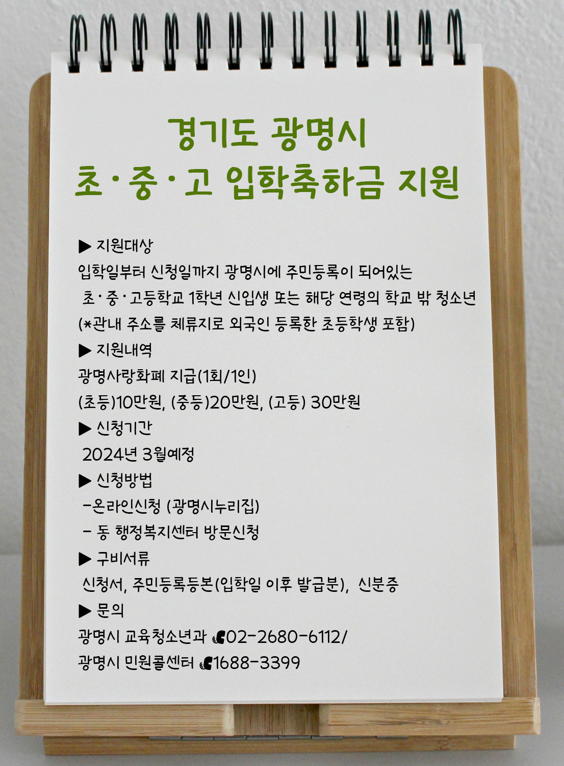 경기도 광명시는 입학일부터 신청일까지 광명시에 주민등록이 되어있는 관내·외 초·중·고등학교(학교와 유사한 교육기관) 1학년 신입생 또는 해당 연령의 학교 밖 청소년 (*관내 주소를 체류지로 외국인 등록한 초등학생 포함)을 대상으로 3월부터 지급합니다. (1회/1인)