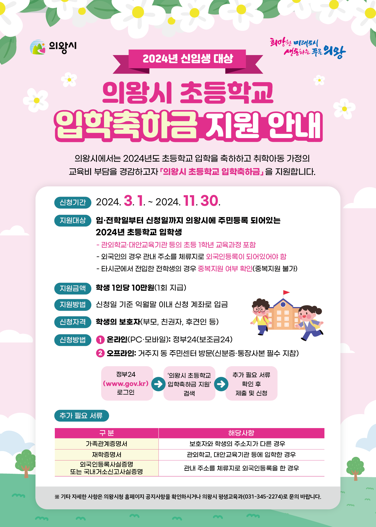 경기도 의왕시는 의왕시에 주민등록을 둔 초등학교 입학생을 대상으로 취학아동 가정의 교육 부담을 덜고자 초등학교 입학 지원금을 지급합니다.