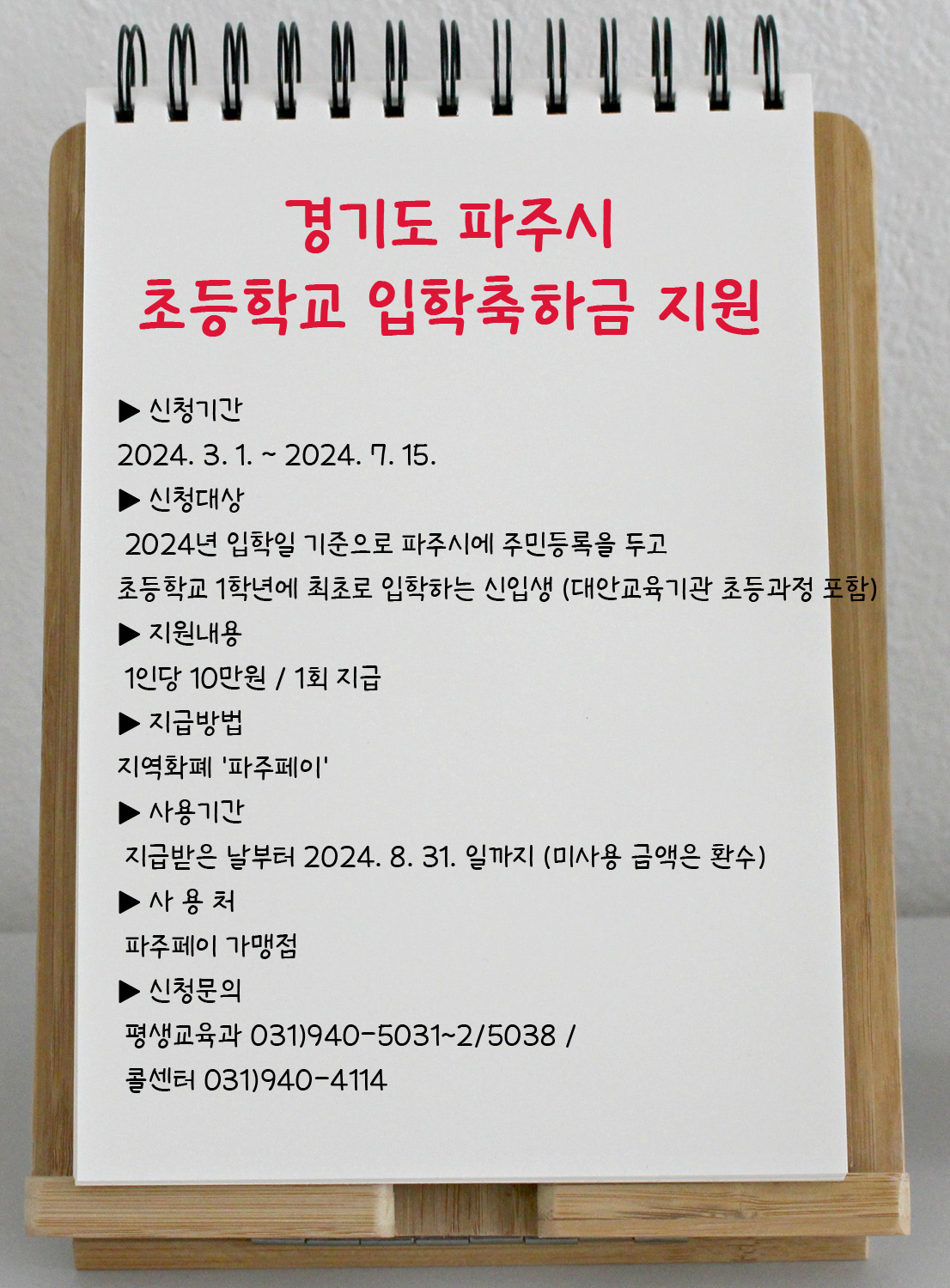 2024년 입학일 기준으로 파주시에 주민등록을 두고 초등학교 1학년에 최초로 입학하는 신입생 (대안교육기관 초등과정 포함) 을 대상으로 1인당 10만원을 파주페이로 지급합니다.