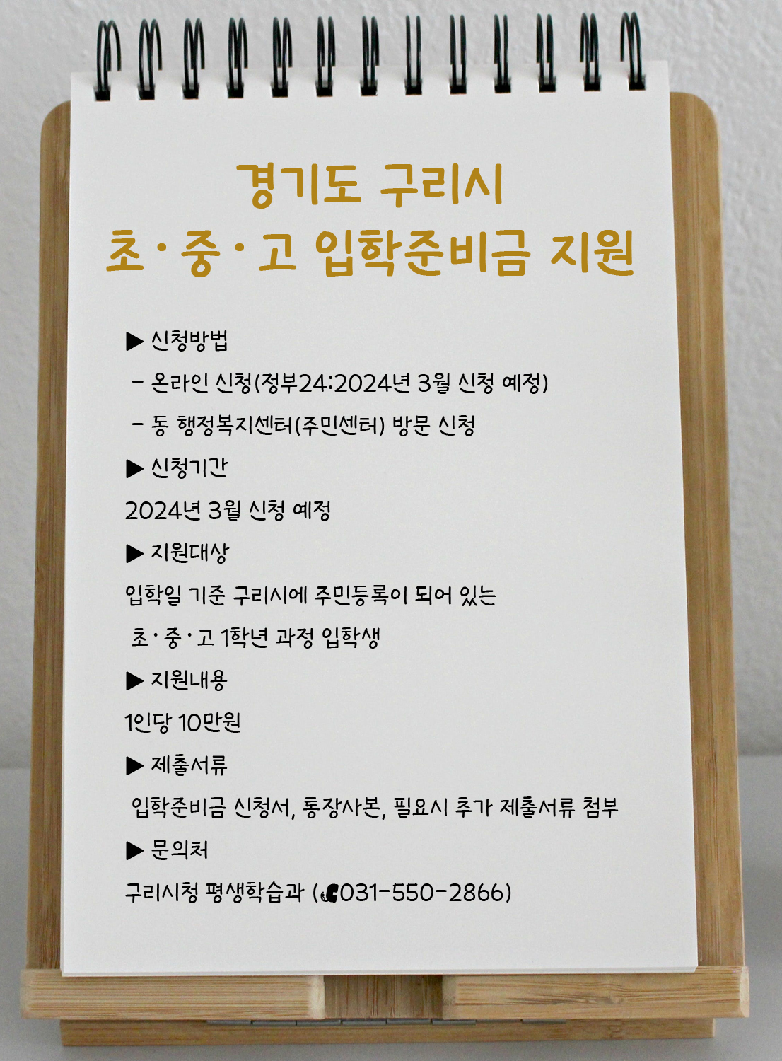 경기도 구리시에서는 교육의 공공성 강화 및 학부모의 교육비 부담 경감을 위하여 입학일 기준 구리시에 주민등록을둔 초.중.고.등학교 1학년 입학생에 대하여 입학준비금을 지원합니다.