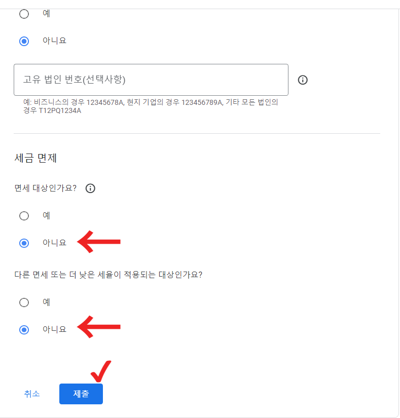 4. 세금면제정보란에 면제대상에는 "아니오"를 선택해준다.