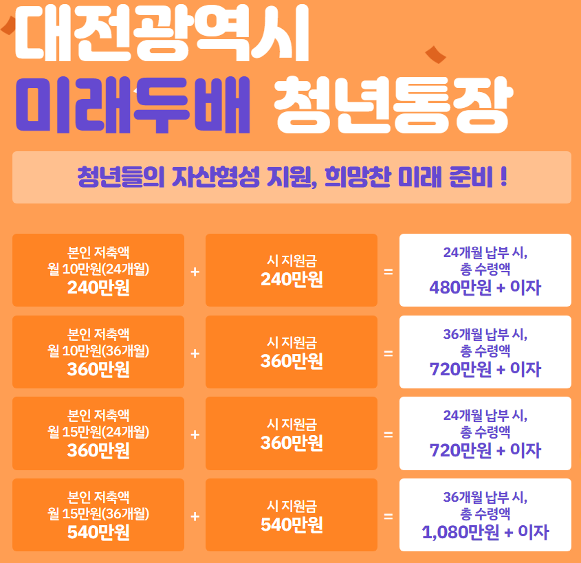 대전광역시에 거주하는 근로청년이 매월 10만원, 15만원 중 선택하여 2~3년간 저축하면 동일한 금액으로 시 지원금을 매칭 적립하는 통장으로, 대전 청년들의 자산형성을 지원하기 위한 사업입니다.