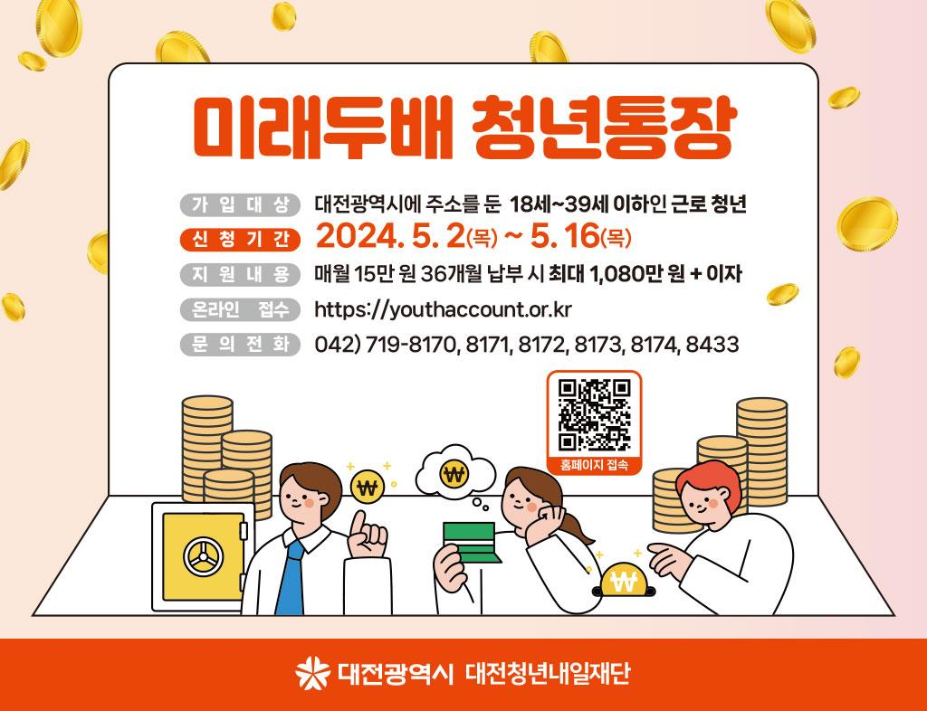 대전광역시에 거주하는 근로청년이 매월 10만원, 15만원 중 선택하여 2~3년간 저축하면 동일한 금액으로 시 지원금을 매칭 적립하는 통장으로, 대전 청년들의 자산형성을 지원하기 위한 사업입니다.