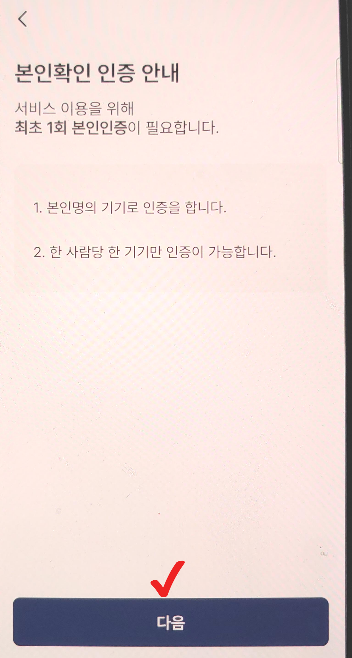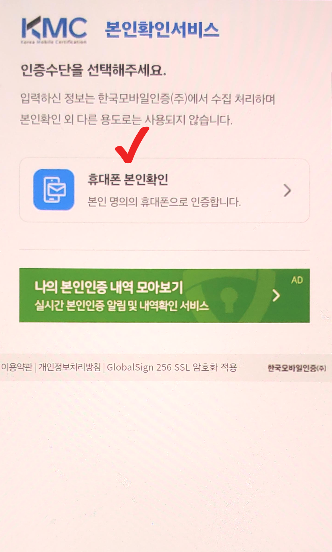 4. 본인확인하기를 선택하고 휴대폰을 통한 PASS 인증 또는 문자 인증을 통하여 본인인증을 완료합니다.