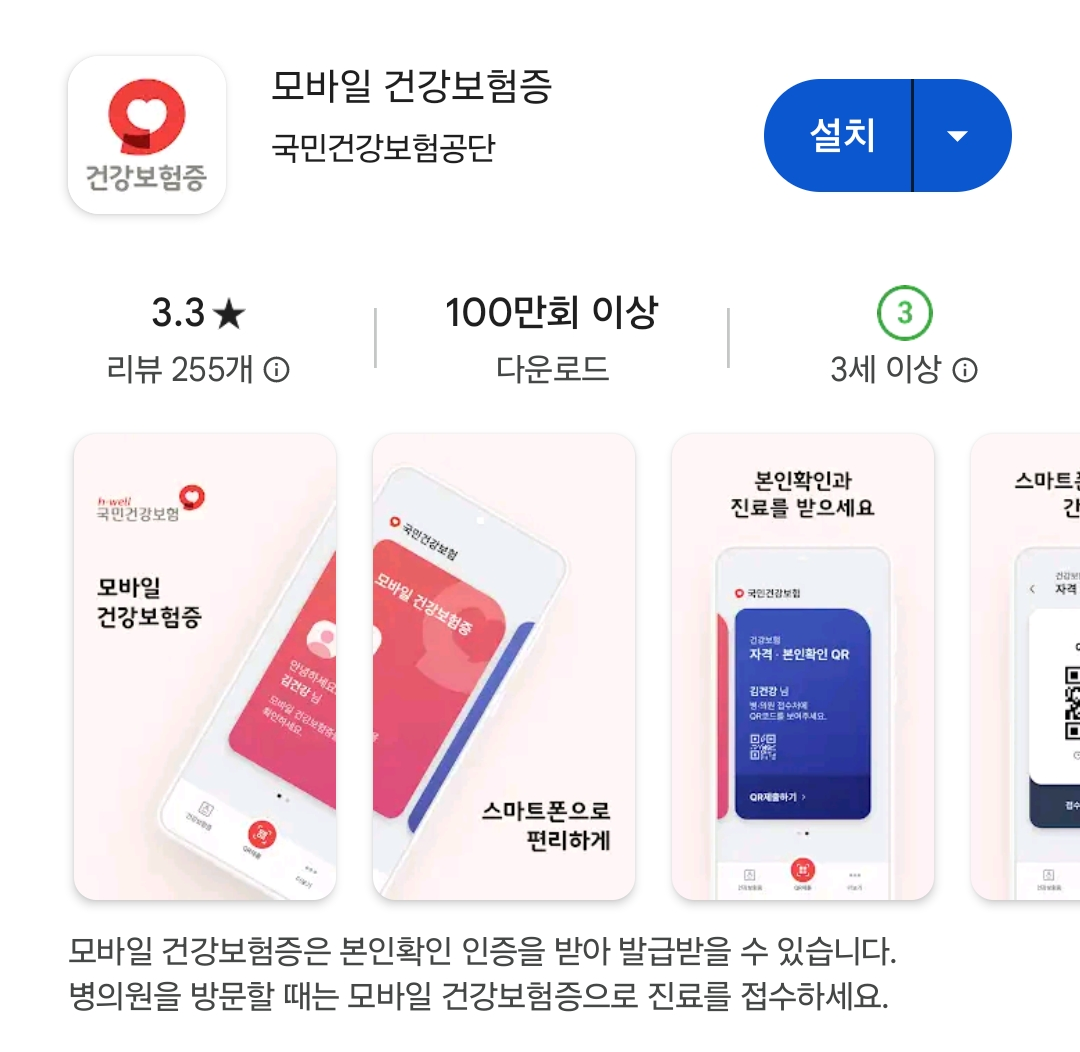 1. Play 스토어 또는 App 스토어 에서 모바일건강보험증 어플을 설치합니다.