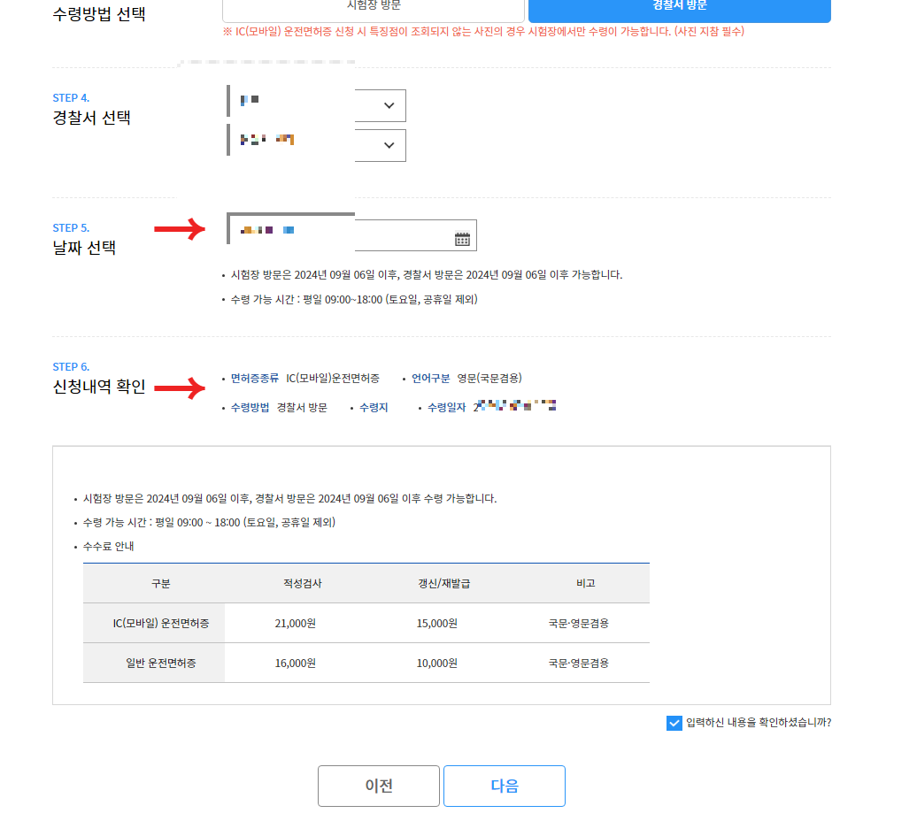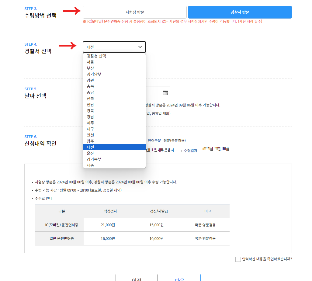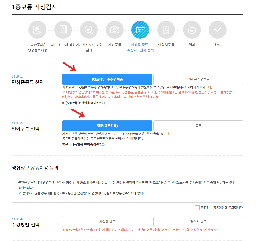 7. 면허증 종류·수령지·날짜 선택
