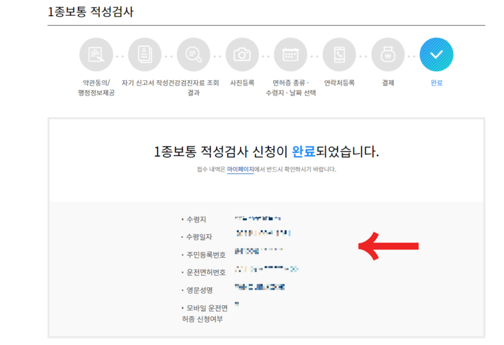 1종 보통 적성검사 신청이 완료 되었습니다.