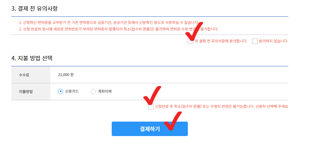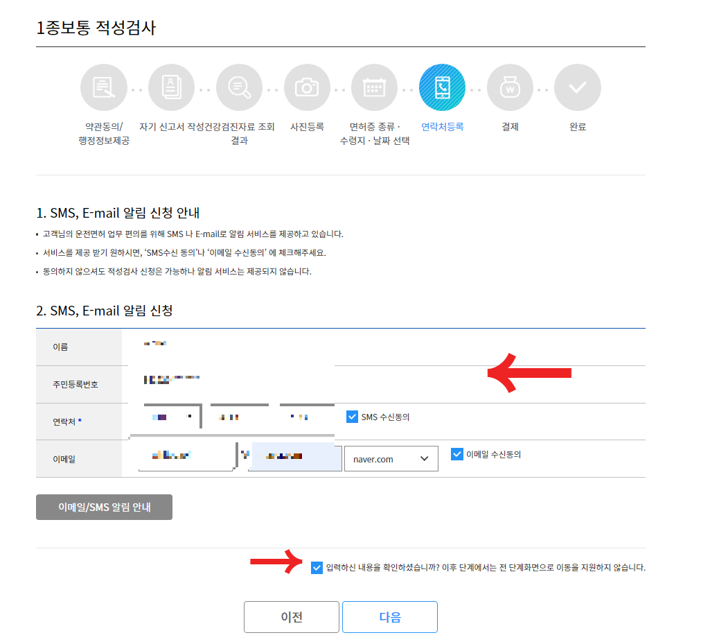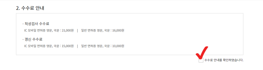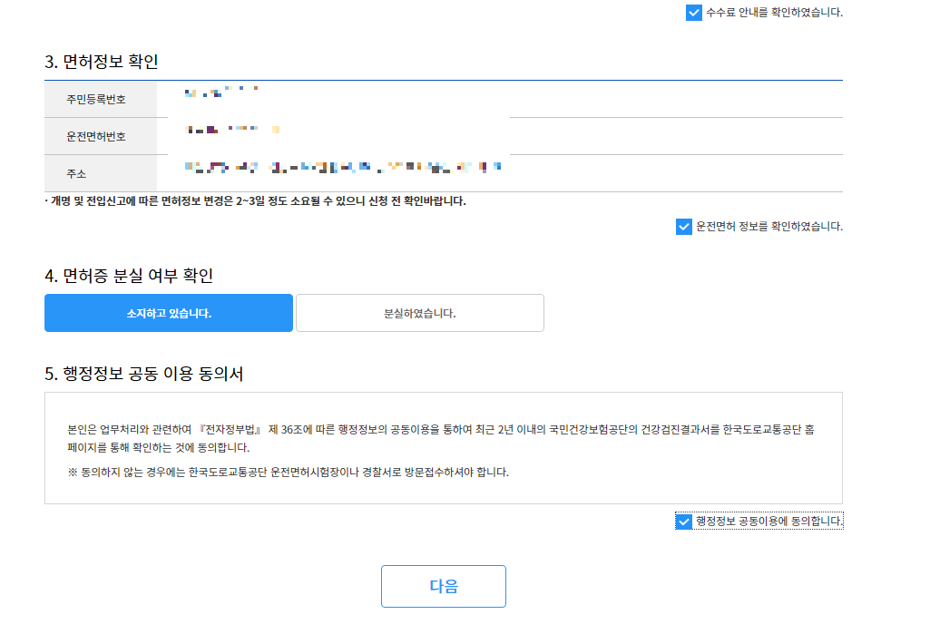 1종보통적성검사 신청 이용약관 동의 및 수수료 확인, 면허정보 확인.