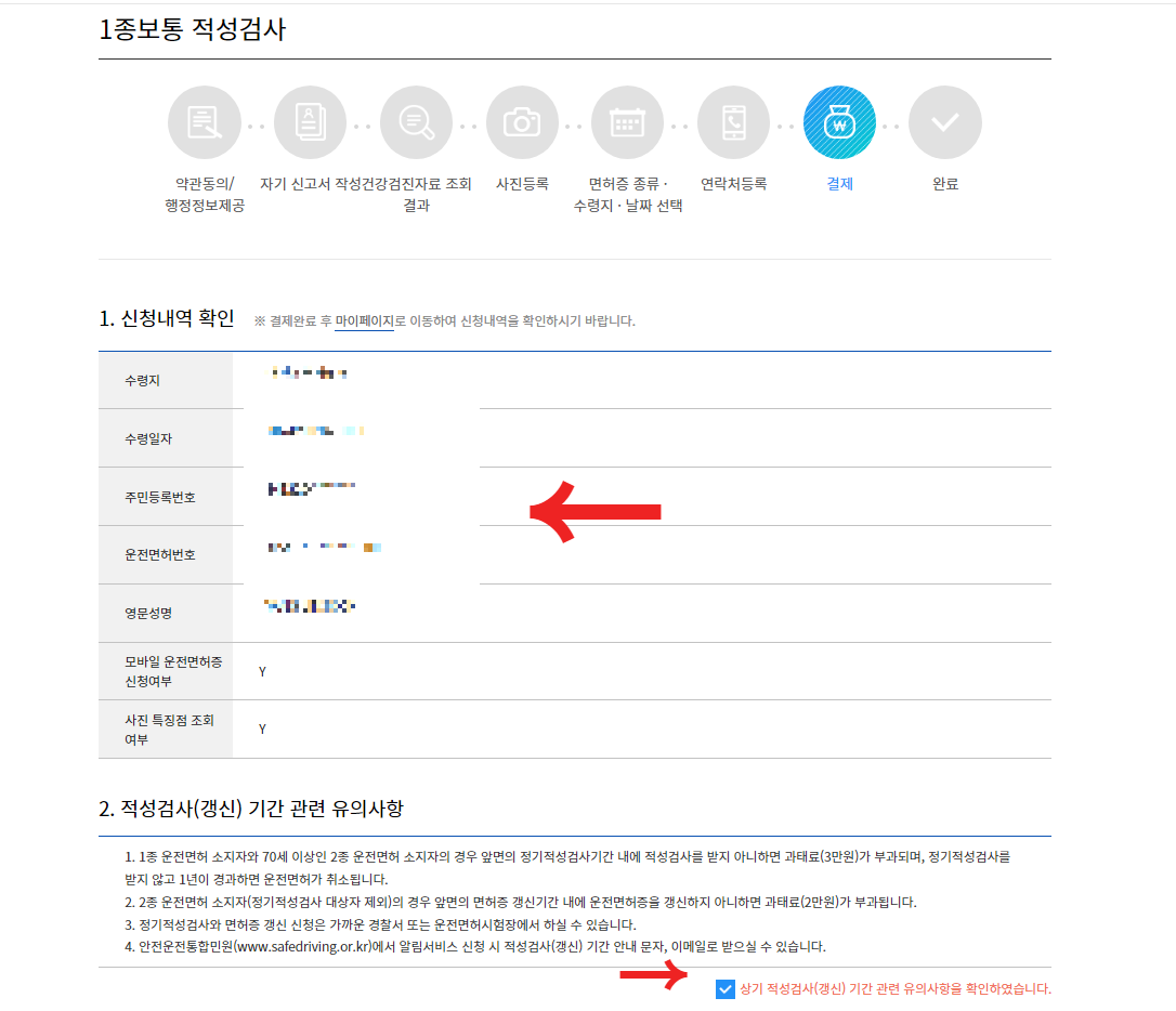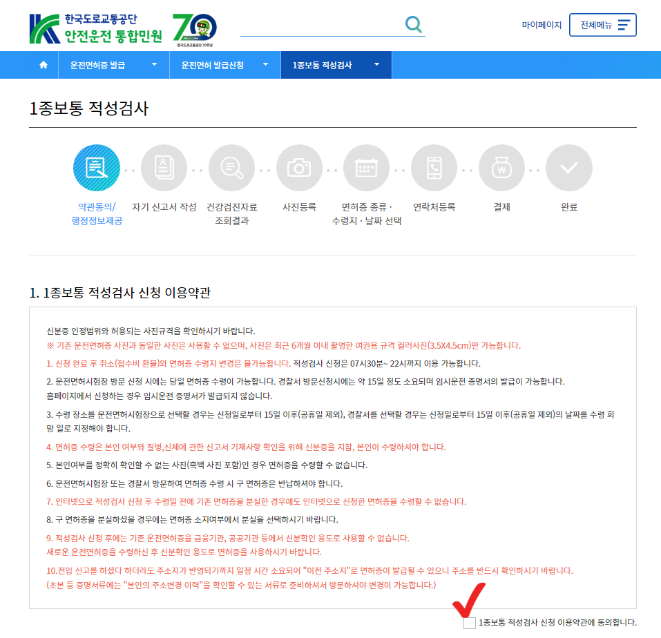 1종보통적성검사 신청 이용약관 동의 및 수수료 확인, 면허정보 확인.