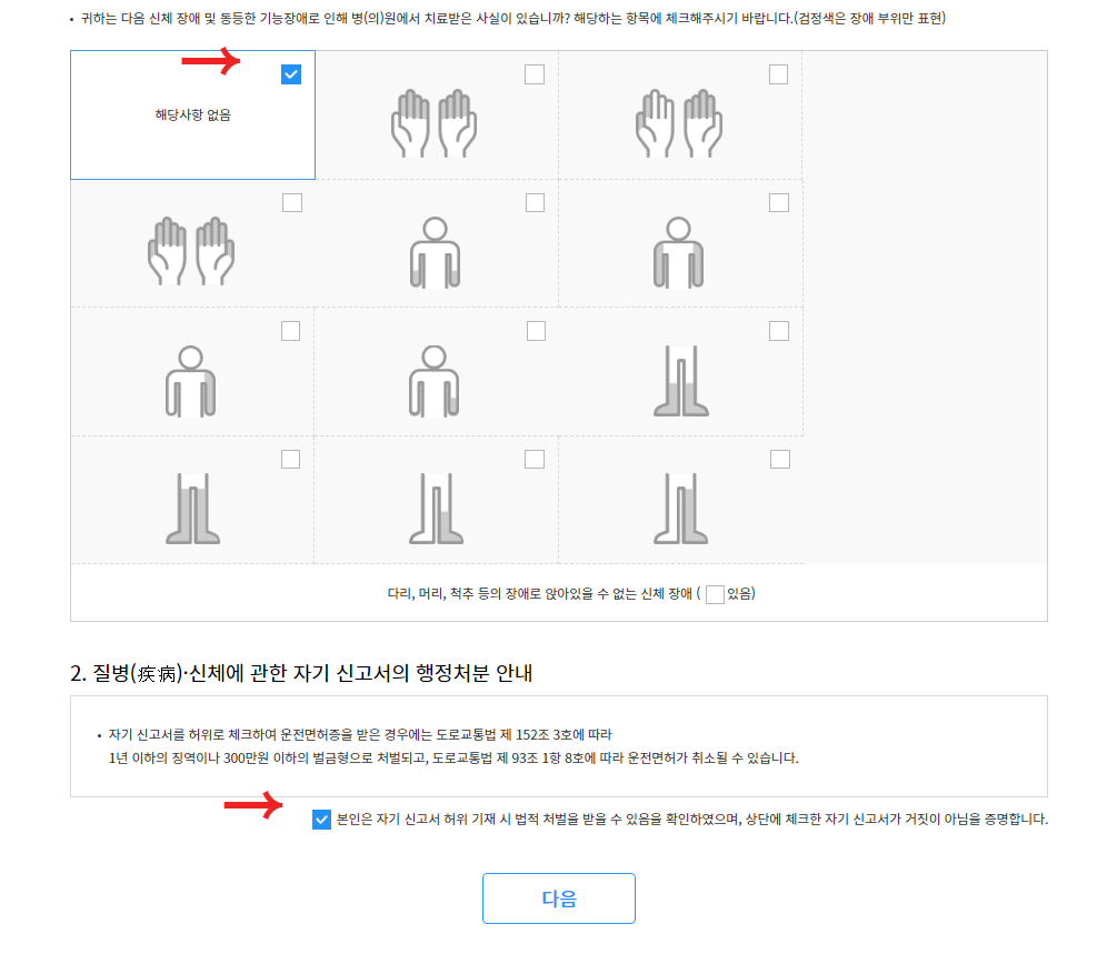 질병 신체에 관하하여 확인후 있음 or 없음 선택해 줍니다. (대부분 없음 이겠죠?)