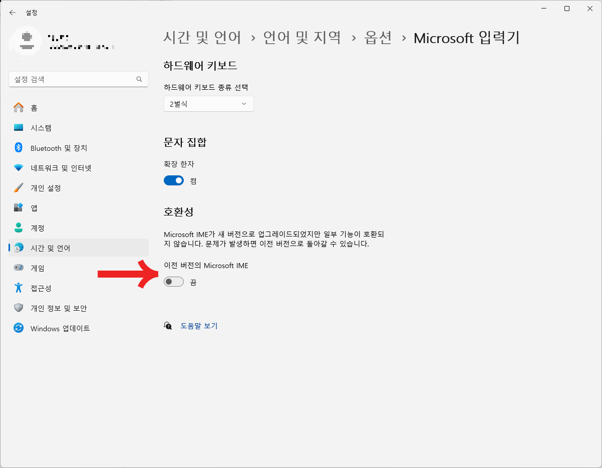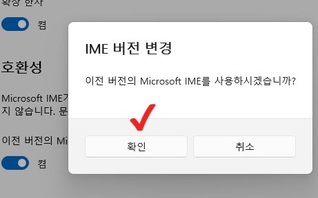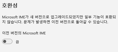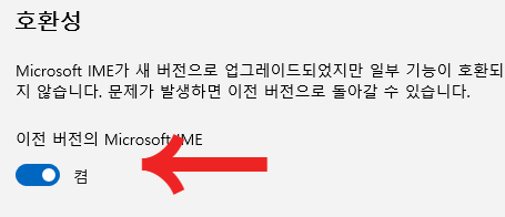 4. 호환성 아래에 보시면 이전버전의 Microsoft IME 탭이 꺼져 있습니다. 이부분을 "켬"으로 변경하여 활성화해줍니다.
