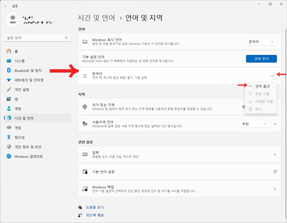 2. 한국어 탭의 왼쪽의 점3개 " ... "를 클릭한 다음 "언어옵션"을 선택합니다.