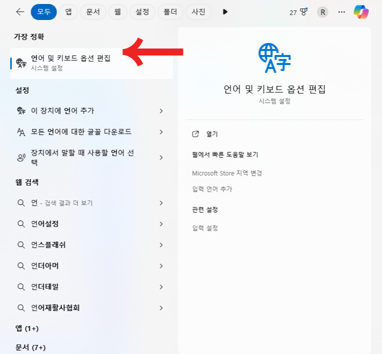 1. 윈도우 검색창에 "언어" 라고 검색해주세요. "언어 및 키보드 옵션 편집"을 선택합니다.