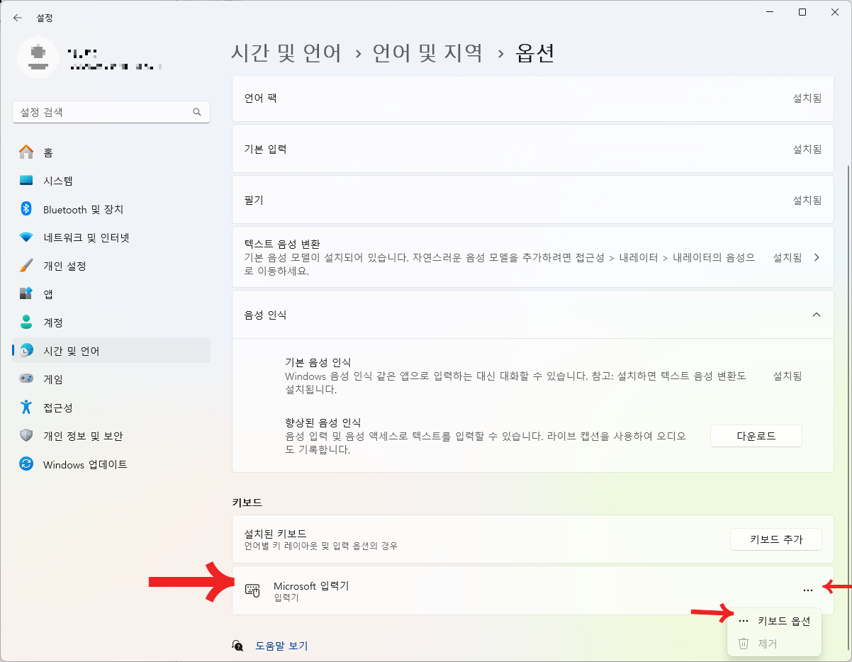 3. Microsoft 입력기 탭의 오른쪽 점3개"..."를 클릭한 다음 "키보드옵션"을 선택합니다.