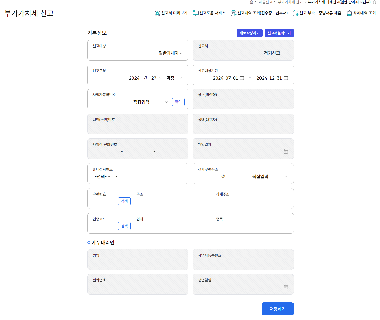 여기서 '부가세 신고'를 클릭하면 신고서 작성 화면으로 이동합니다.