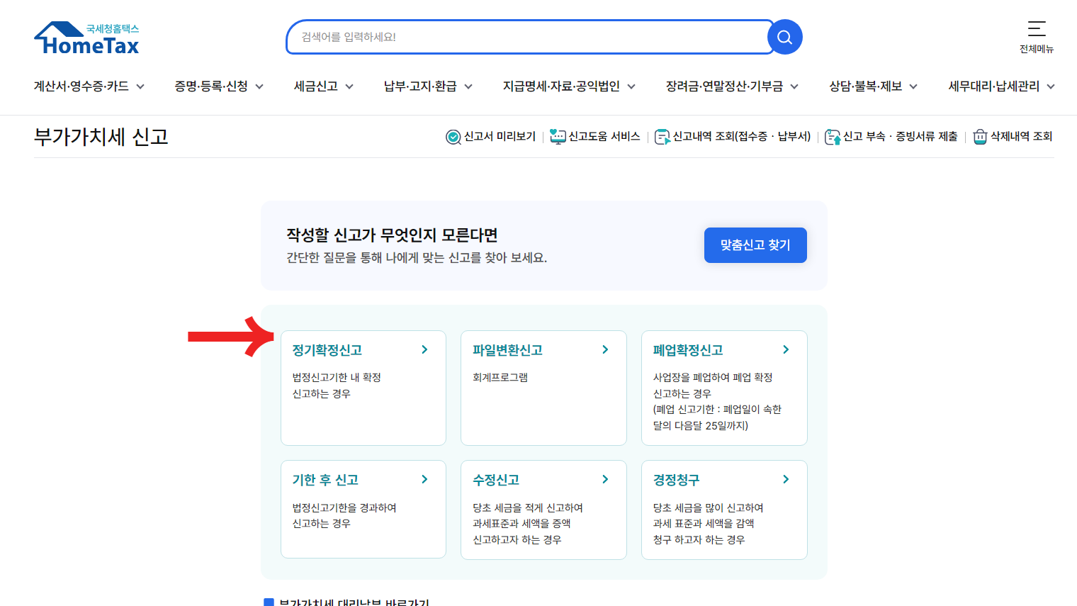 - '신고/납부' 메뉴 선택
