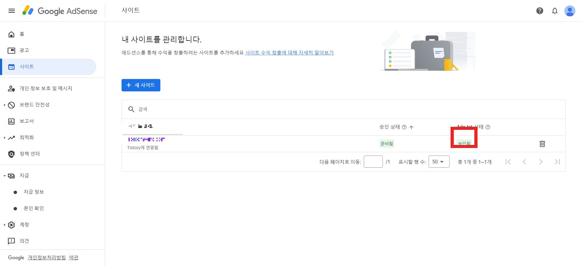 5일 지나니 애드센스 계정에 알림이 사라지고 승인됨 으로 변경되었습니다.