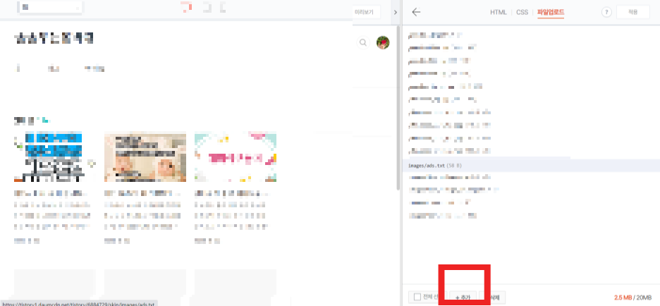 6. 스킨편집-오른쪽 상단의 HTML 편집을 클릭하고 위쪽에 파일 업로드를 선택합니다.
