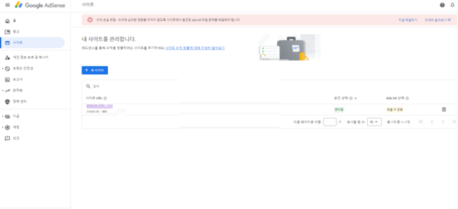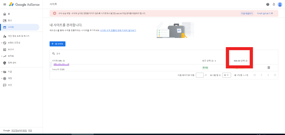 수익손실위험 - 수익에 심각한 영향을 미치지 않도록 사이트에서 발견된 ads.txt파일 문제를 해결해야 합니다.