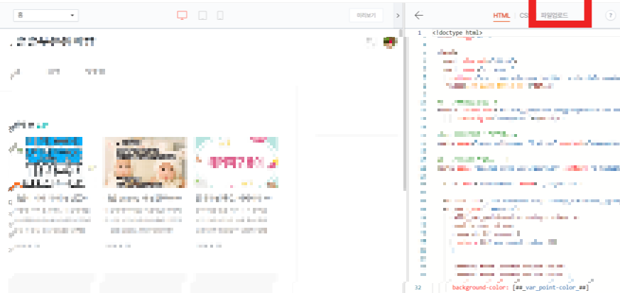 6. 스킨편집-오른쪽 상단의 HTML 편집을 클릭하고 위쪽에 파일 업로드를 선택합니다.