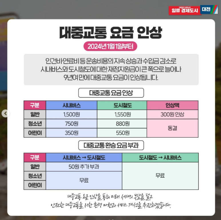 대전 대중교통요금은 2015년 이후 9년째 요금이 동결 되었다가 이번에 인상되었습니다.