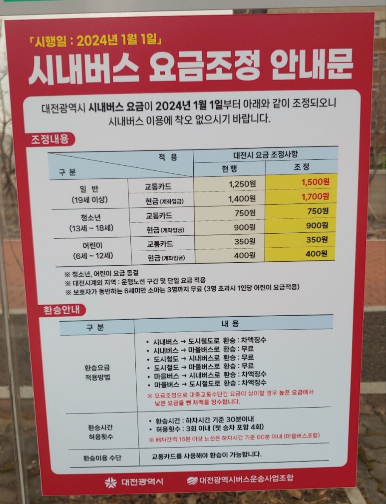 대전 대중교통요금은 2015년 이후 9년째 요금이 동결 되었다가 이번에 인상되었습니다.