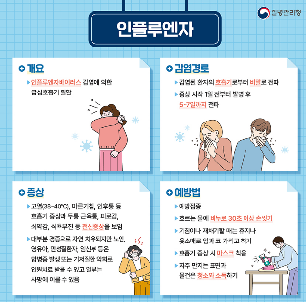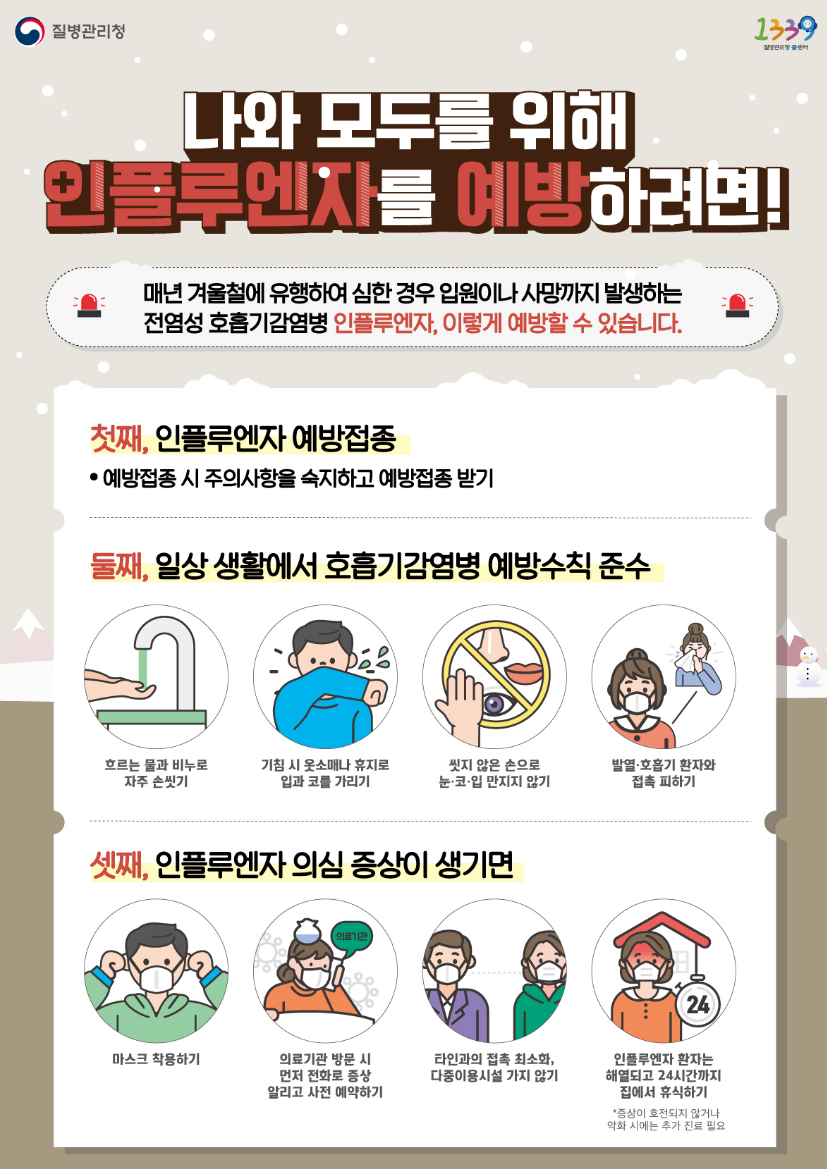 가장 효과적인 방법은 매년 독감 예방접종(10~11월)을 받는 것입니다.